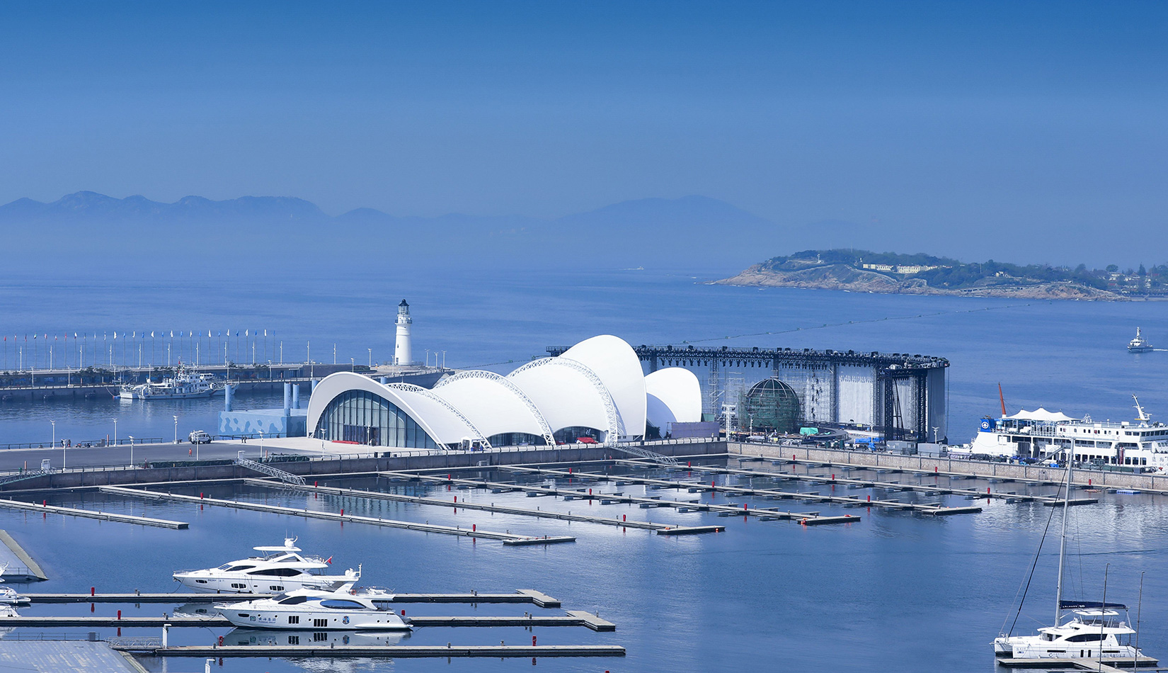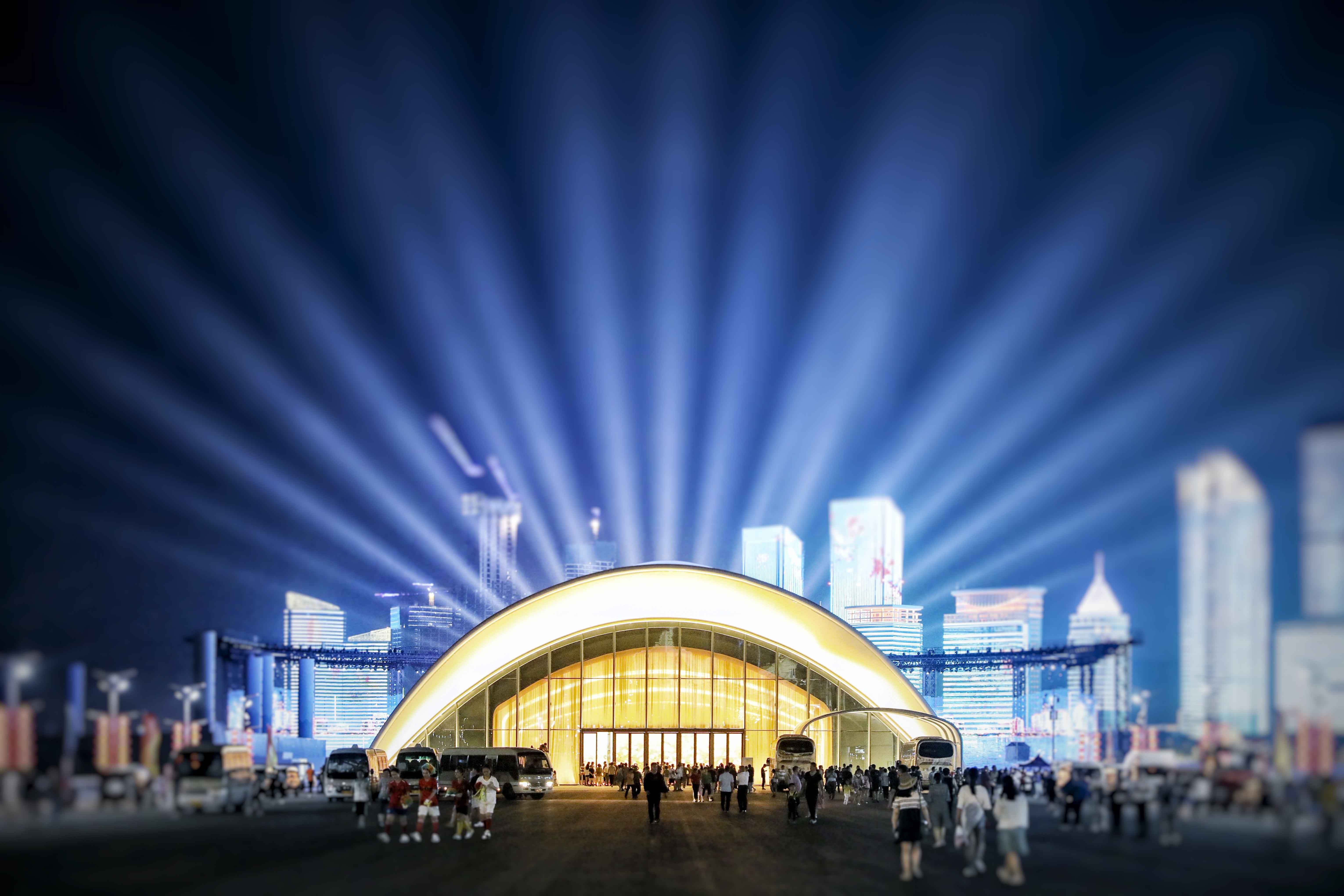 本項目在保留原有建筑主體結構的基礎上,結合本次會議活動的相關需求,對其規(guī)模、形象、功能進行改造提升。主題材料采用輕盈的鋼結構與膜結構,造型宛如海浪中靈動的風帆,彰顯青島這座海洋名稱、帆船之都的獨特魅力。