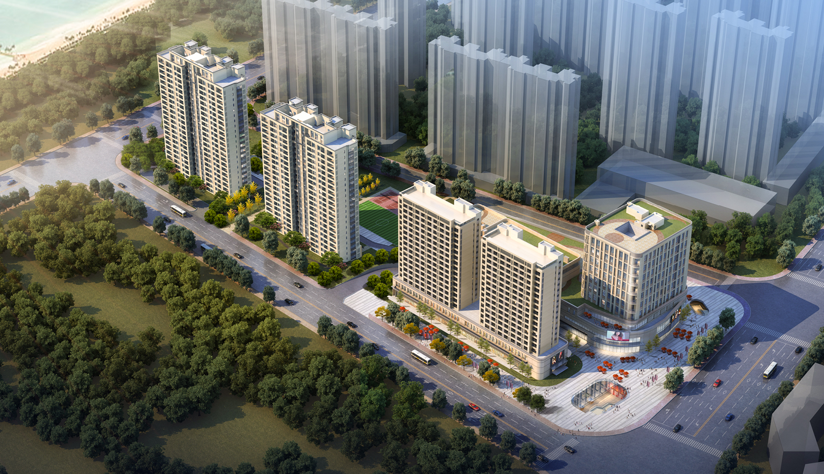 合理的功能分區(qū),沿城市主干道打造社區(qū)服務(wù)配套設(shè)施,服務(wù)小區(qū)及周邊居民,住宅建筑在融合城市肌理的情況下,最大限度遠(yuǎn)離北側(cè)已建的住宅區(qū),減少對北側(cè)已有住宅的遮擋及影響。本項(xiàng)目充分利用地下公交首末站,采用了類地鐵上蓋的商業(yè)模式。