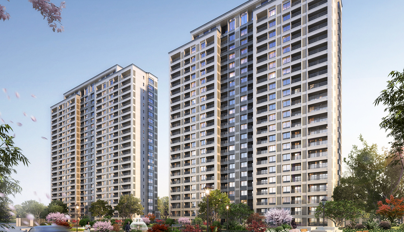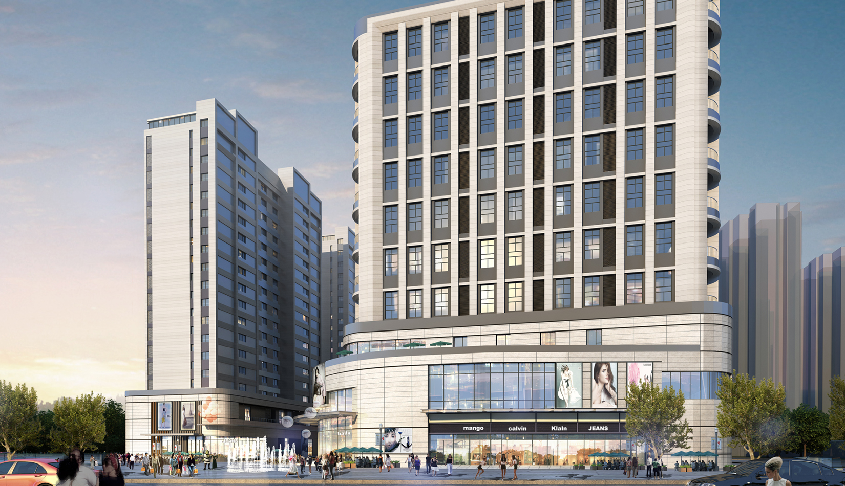 立面打造可識別性的“社區(qū)”建筑語匯,在周邊版塊中做到脫穎而出。建筑風(fēng)格莊重精美,通過運(yùn)用傳統(tǒng)美學(xué)法則來使現(xiàn)代的材料與結(jié)構(gòu)產(chǎn)生規(guī)整、端莊、典雅的安定感。商業(yè)立面通過將具有力量感的矩形石材墻面和玻璃幕墻進(jìn)行體塊穿插與虛實(shí)結(jié)合。勾勒出與住宅風(fēng)格一致的現(xiàn)代,簡約,富有商業(yè)氣息的造型。同時(shí),創(chuàng)造出豐富的露臺空間與立面層次,完美的樹立了本項(xiàng)目的沿街形象。