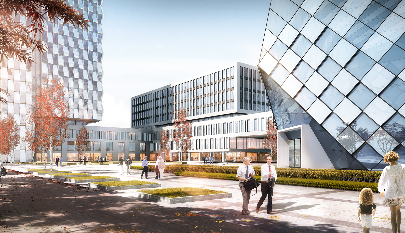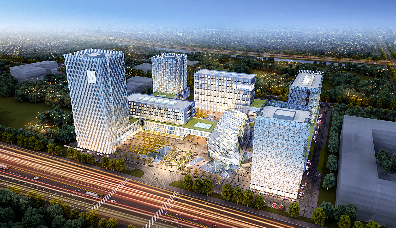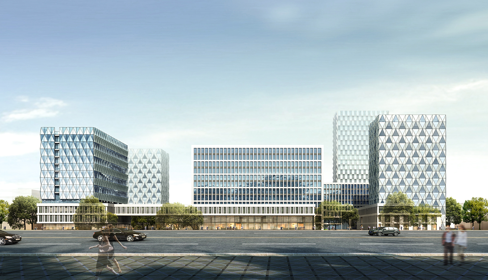 建筑立面風格現(xiàn)代簡潔,高層塔樓以玻璃與金屬幕墻為主,塑造其硬朗簡潔的建筑性格,內(nèi)部兩棟建筑采用格構(gòu)式立面風格,同樣以簡潔為設(shè)計原則,展現(xiàn)其富有理性秩序的立面形象。