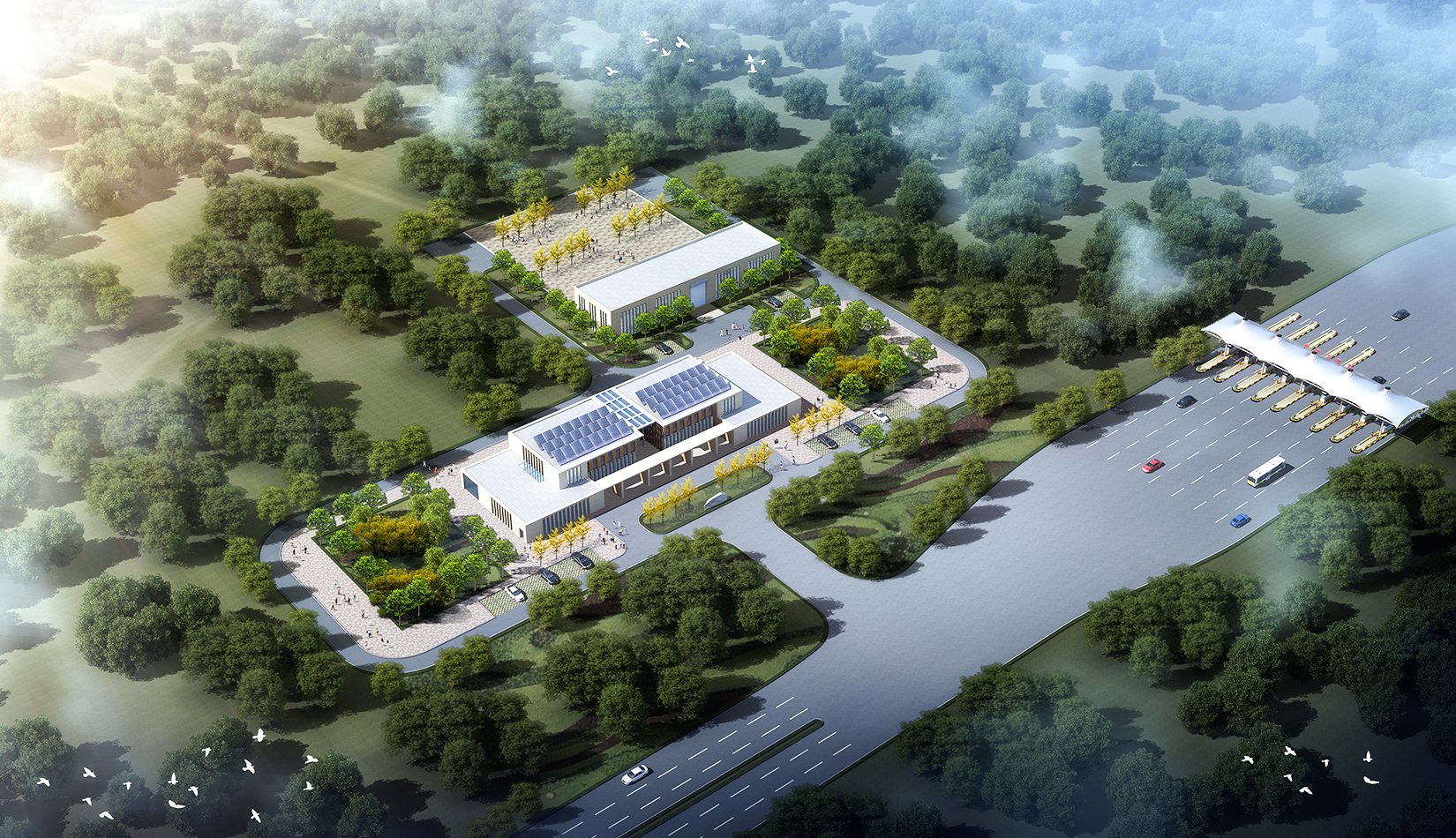 新機(jī)場(chǎng)高速公路是膠東國(guó)際機(jī)場(chǎng)集疏運(yùn)系統(tǒng)的重要組成部分,是連接我市主城區(qū)的迎賓大道。主線收費(fèi)廣場(chǎng)作為青島的門戶,旅客來青的第一印象,方案設(shè)計(jì)充分體現(xiàn)青島城市特征,建筑形式與新機(jī)場(chǎng)航站樓“海星”造型相互呼應(yīng),從“建筑風(fēng)格、視覺傳達(dá)、空間感受”三個(gè)方面完善方案設(shè)計(jì),遵從生態(tài)環(huán)保原則,實(shí)現(xiàn)收費(fèi)雨蓬、站房、生態(tài)環(huán)境協(xié)調(diào)統(tǒng)一,結(jié)合地域特色與地產(chǎn)描畫,展現(xiàn)城市海洋文化。