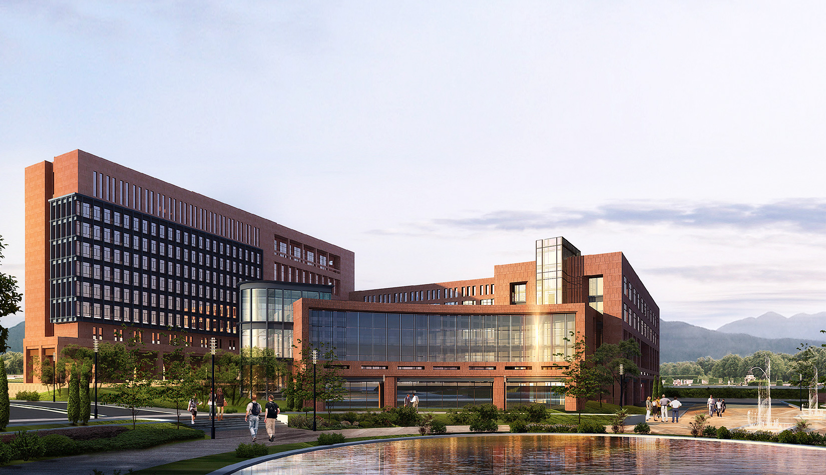 總體的規(guī)劃布局圍繞中心景觀廣場展開設(shè)計(jì)。首先從山區(qū)建筑布局師法自然,藏風(fēng)聚氣的傳統(tǒng)觀念出發(fā),結(jié)合現(xiàn)代科學(xué)嚴(yán)謹(jǐn)求真務(wù)實(shí)的態(tài)度,設(shè)計(jì)以東側(cè)入口廣場導(dǎo)入的中心景觀空間圍合展開規(guī)劃布局,總體上根據(jù)土地的使用性質(zhì)分為四個區(qū),分別是正對主入口北側(cè)的生活區(qū),南側(cè)的孵化中心區(qū),正對主入口廣場的科研辦公區(qū),以及整個用地最南端的產(chǎn)業(yè)開發(fā)區(qū),各個區(qū)既相互獨(dú)立同時又緊密聯(lián)系,功能上即考慮主導(dǎo)風(fēng)向又方便使用。