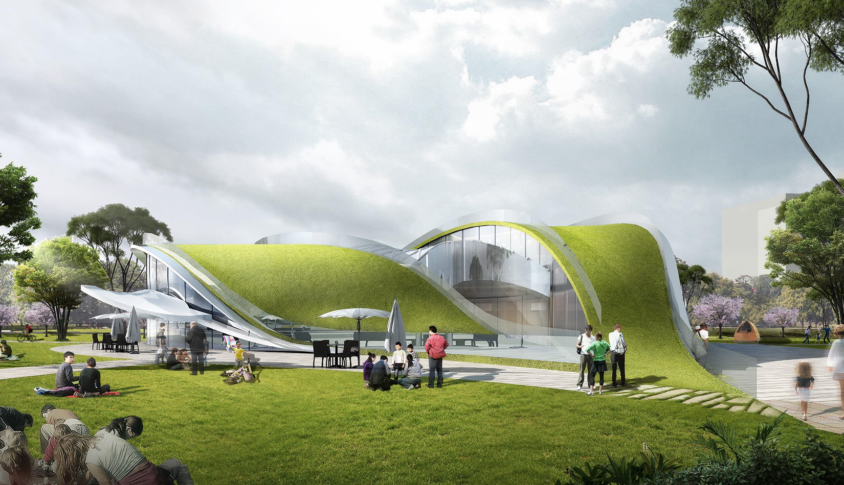 該項目基地位于濱河公園內(nèi),目標(biāo)要將博物館打造成一個生態(tài)建筑,建筑能與環(huán)境有機(jī)融合。在這一理念下,將博物館設(shè)計為樹葉形,建筑猶如一片樹葉飄落在公園內(nèi),以此體現(xiàn)建筑與環(huán)境的融合。將樹葉形建筑設(shè)計為覆土建筑,最大程度還原基地一片綠色,以此呼應(yīng)李村大集的“還原”內(nèi)涵。通過設(shè)計兩個曲線形體相互交融形成建筑的最終體量,以此體現(xiàn)相逢意蘊(yùn),呼應(yīng)李村大集的“相逢”內(nèi)涵。